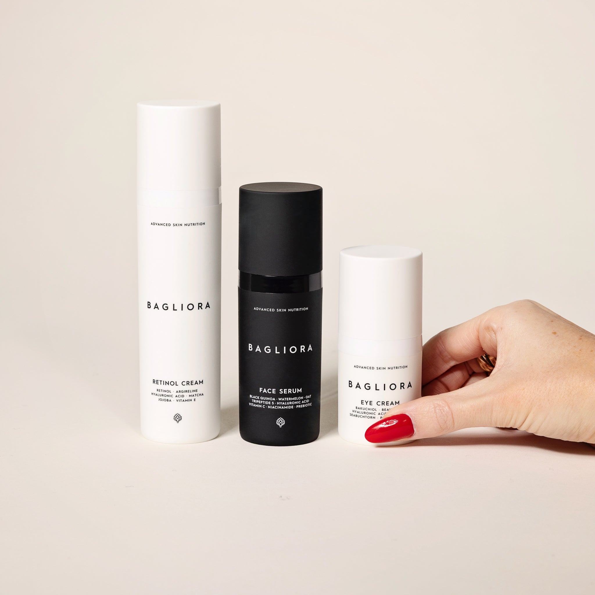 I samtliga av Baglioras produkter har vi valt ut hudälskande antioxidanter, omega-fettsyror, prebiotika och vitaminer samt näringsämnen som är vanliga i en antiinflammatorisk kost, som skyddar, balanserar och stärker huden. I kombination med denna näringsrika bas har vi tillsatt de mest effektiva aktiva ingredienserna med kliniskt bevisad effekt på kollagenproduktion, återfuktning, klarhet och anti-age.