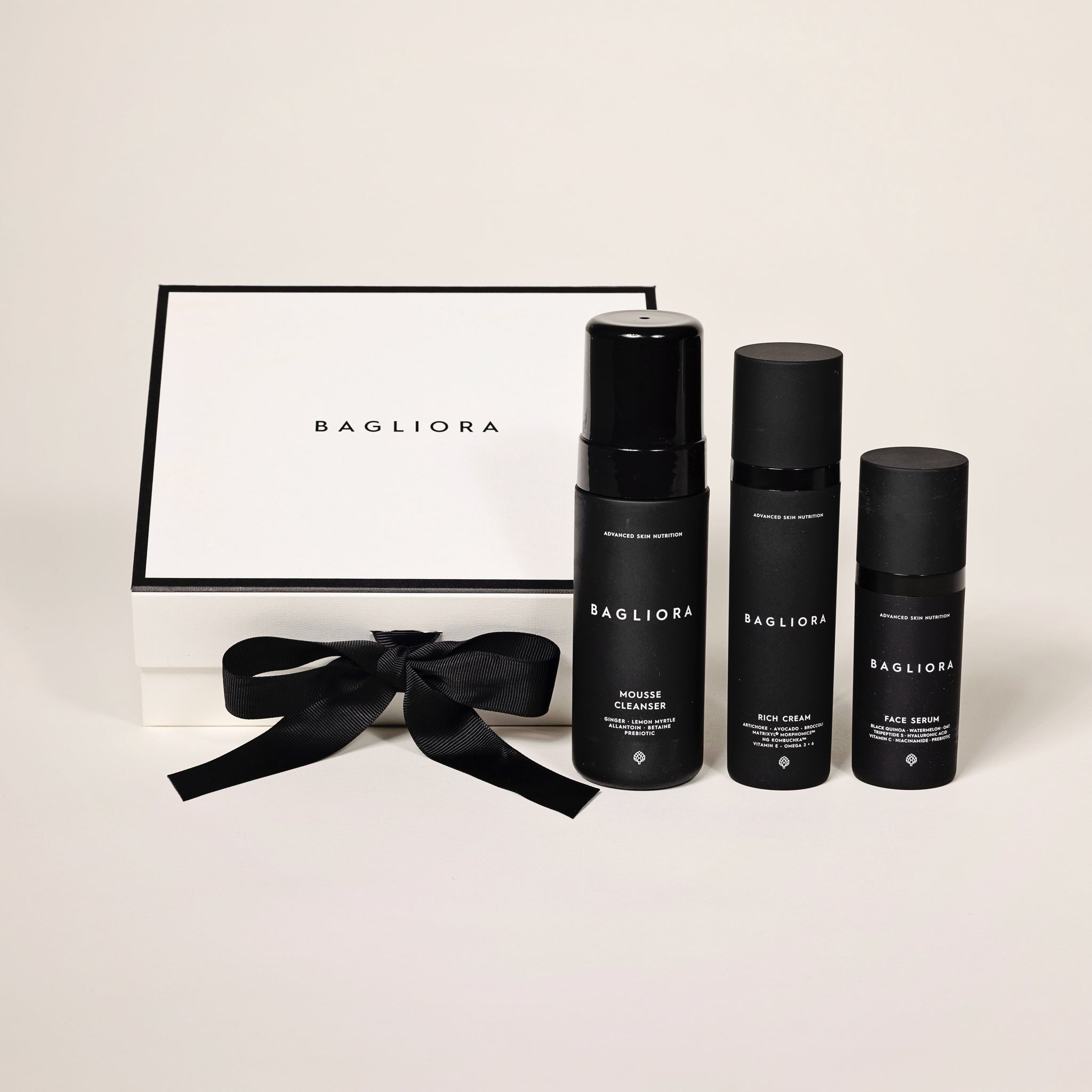 I samtliga av Baglioras produkter har vi valt ut hudälskande antioxidanter, omega-fettsyror, prebiotika och vitaminer samt näringsämnen som är vanliga i en antiinflammatorisk kost, som skyddar, balanserar och stärker huden. I kombination med denna näringsrika bas har vi tillsatt de mest effektiva aktiva ingredienserna med kliniskt bevisad effekt på kollagenproduktion, återfuktning, klarhet och anti-age.